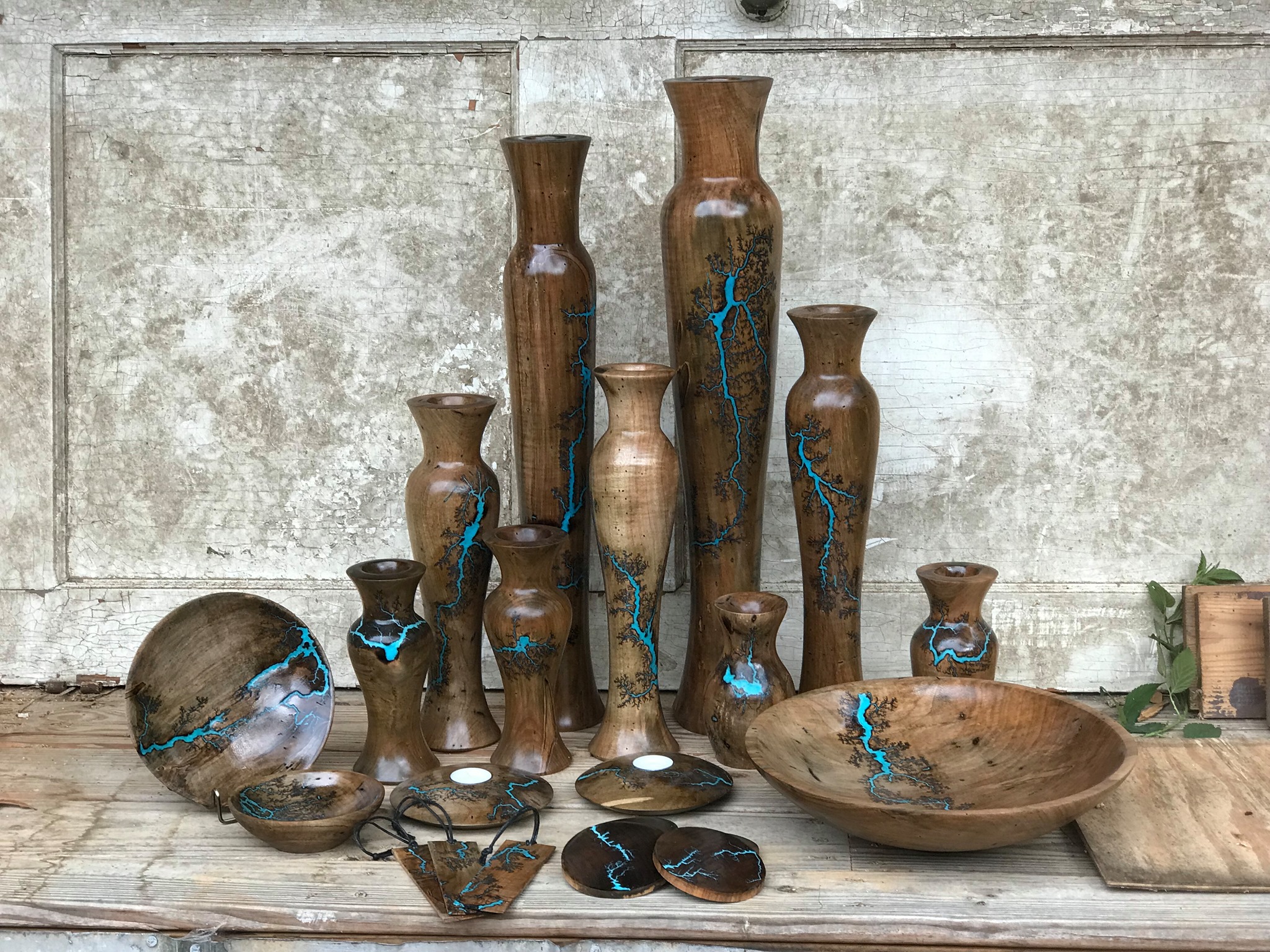 Jason and Russ use this technique on their wood-turned pieces to create truly unique items. They enhance the dramatic fractal burns with stunning inlays like turquoise, copper, glow-in-the-dark epoxy, and even 24k gold leaf—making each piece an unforgettable work of art.